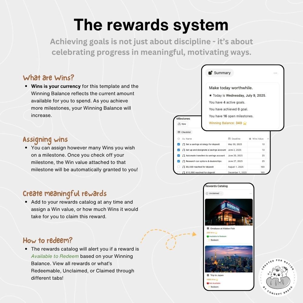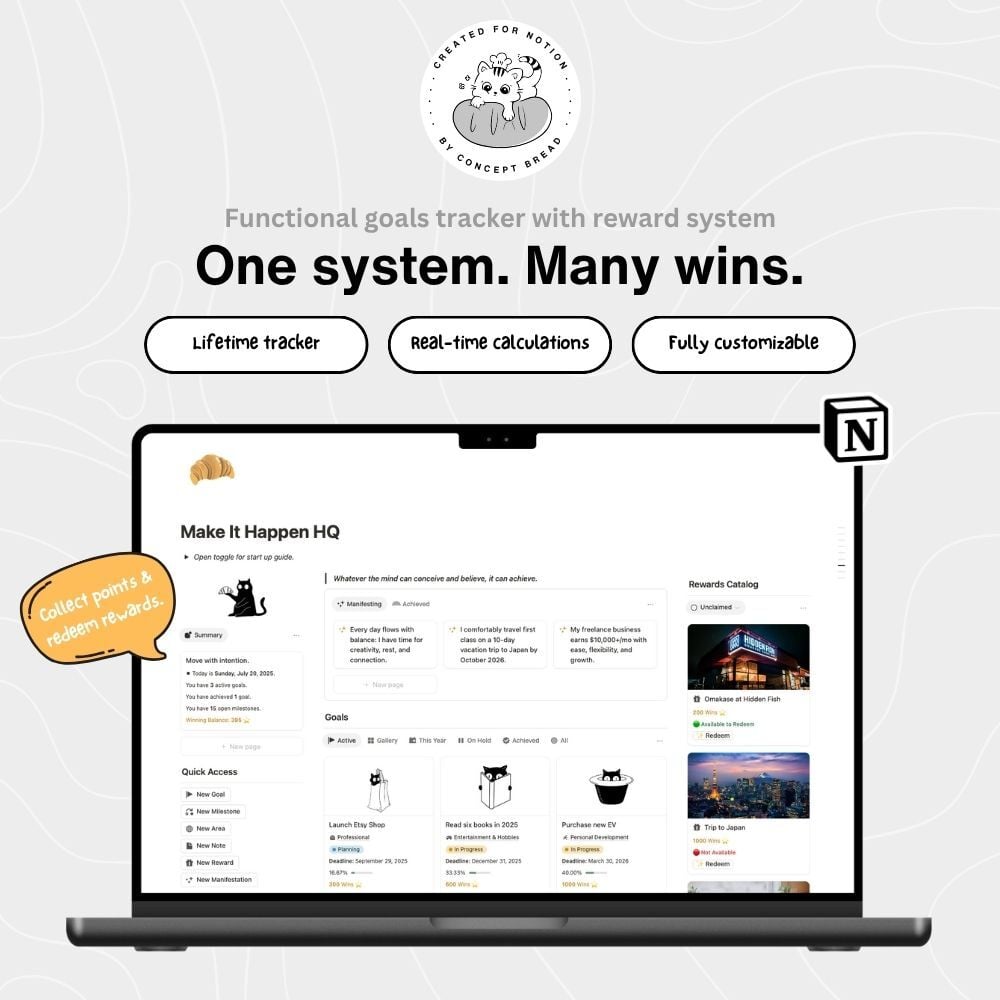 Notion Goals Template with Functional Rewards System - Make It Happen HQ (includes Milestones tracking, Notes archive, Manifestations board)