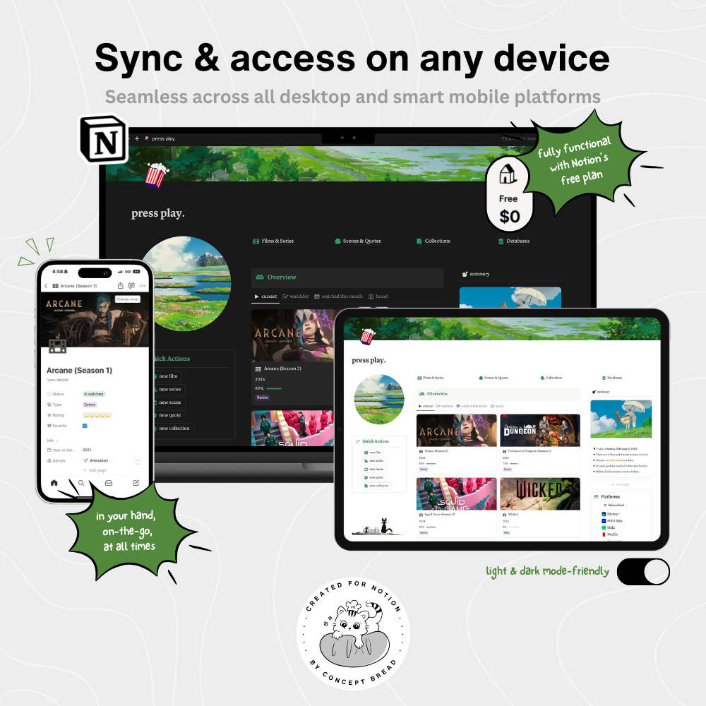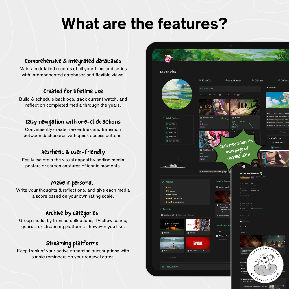 Notion Template: Ultimate Media Movies & Shows Personal Tracker - press play (includes Scenes, Quotes, and Collections Archive)
