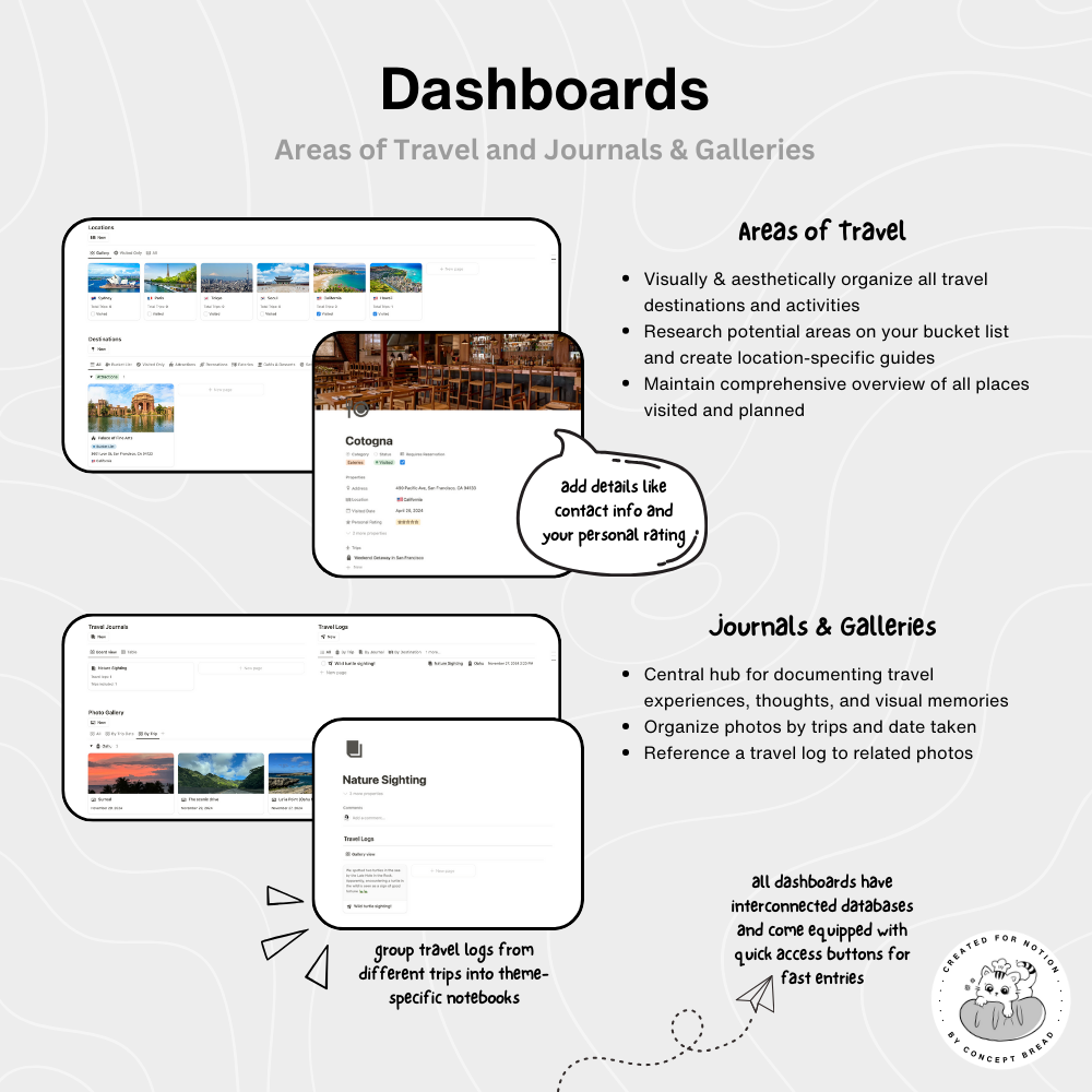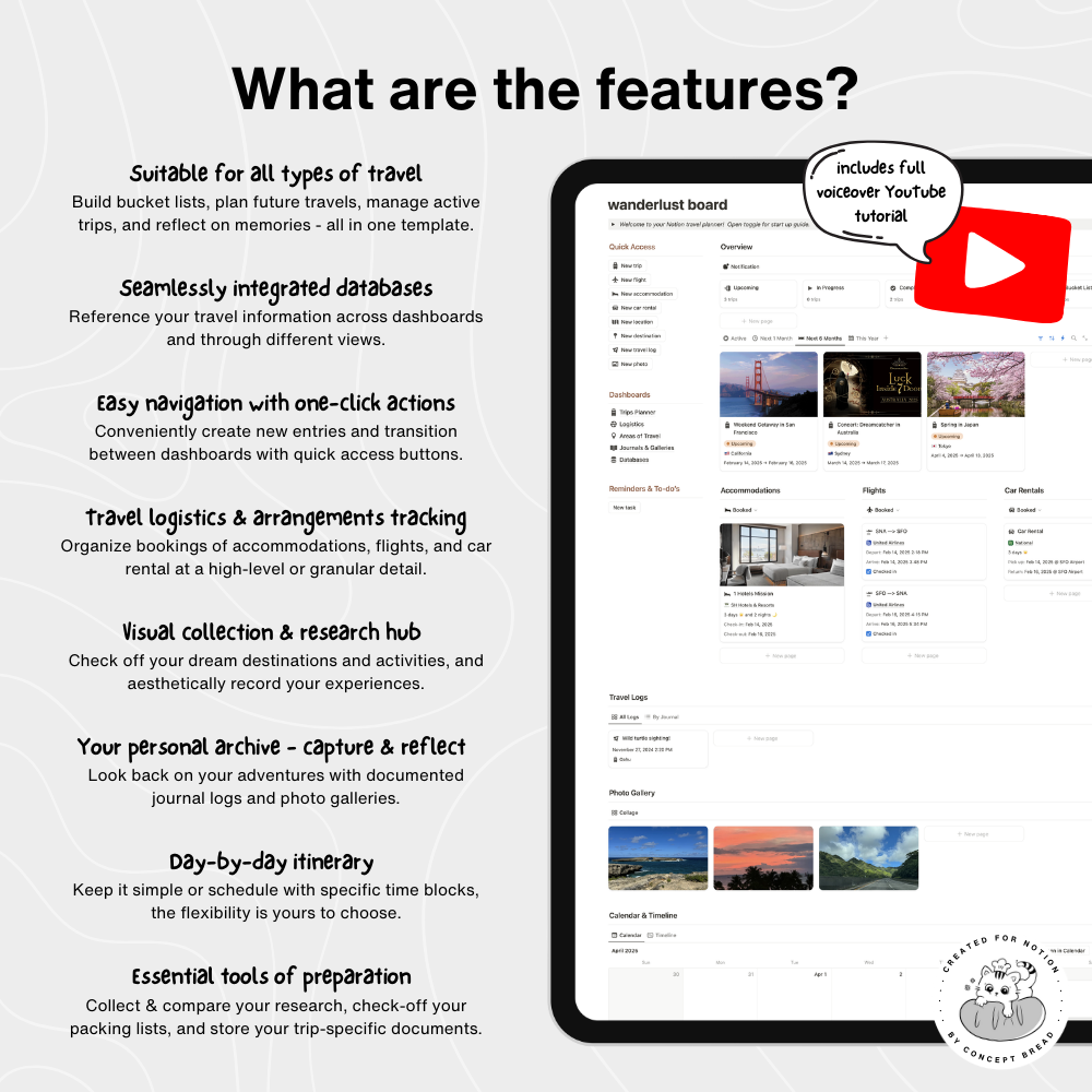 - A Notion account. This template is fully functional with a free personal account! Sign-up here: https://affiliate.notion.so/conceptbread- A digital device to access Notion (desktop PC, laptop, smartphone, tablet, etc.)